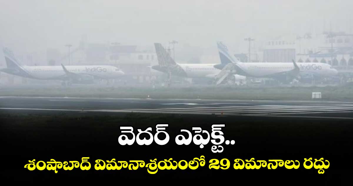 శంషాబాద్, వెలుగు: వాతావరణం అనుకూలించకపోవడంతో శంషాబాద్ విమానాశ్రయంలో ఇప్పటివరకు 29 విమానాలు రద్దయ్యాయని విమానయాన అధికారులు తెలిపారు. మంగళవారం శంషాబాద్ నుంచి ఢిల్లీ వెళ్లాల్సిన 12 ఇండిగో, 2 ఎయిర్ ఇండియా విమానాలు రద్దయ్యాయి.