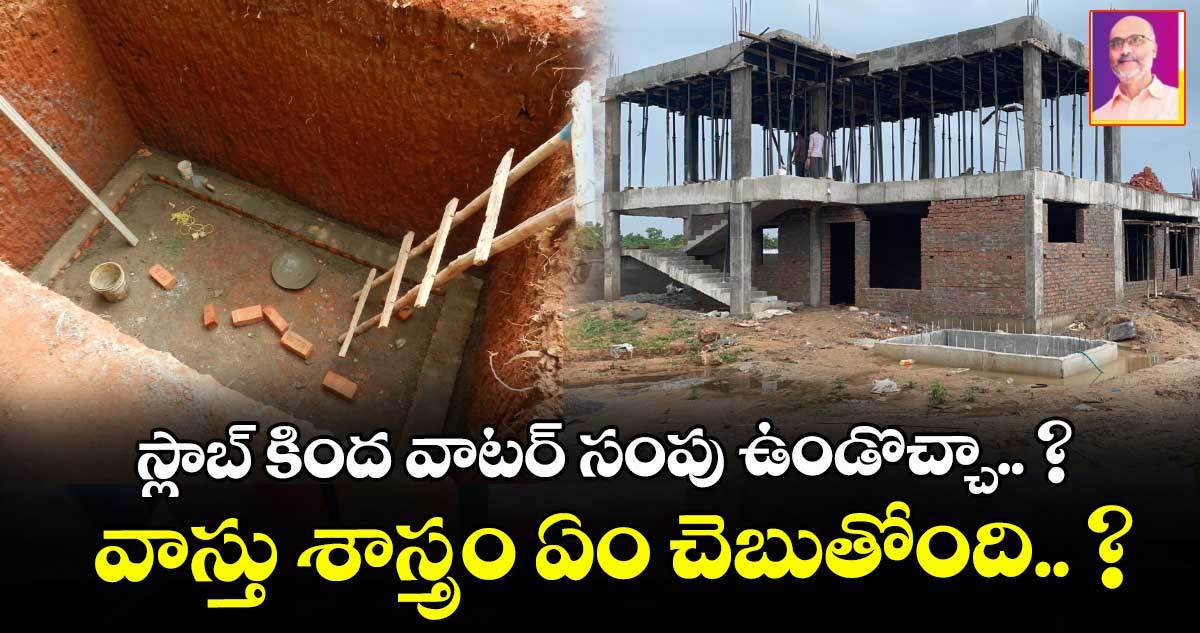స్లాబ్ కింద వాటర్ సంపు ఉండొచ్చు. కానీ ఇంటి సింహద్వారానికి ముందు మాత్రం ఉండకూడదు. భూమి లోపల ఉత్తర ఈశాన్యం లేదా తూర్పు ఈశాన్యం వైపు వాటర్సంపు ఏర్పాటుచేసుకోవచ్చు. నీళ్లతో నిండి ఉండే వాటర్ సంపుపై నడవడం అంత మంచిదికాదు. ఒకవేళ నడవాల్సి వస్తే, దాని పక్కనుంచి నడవాలి.
