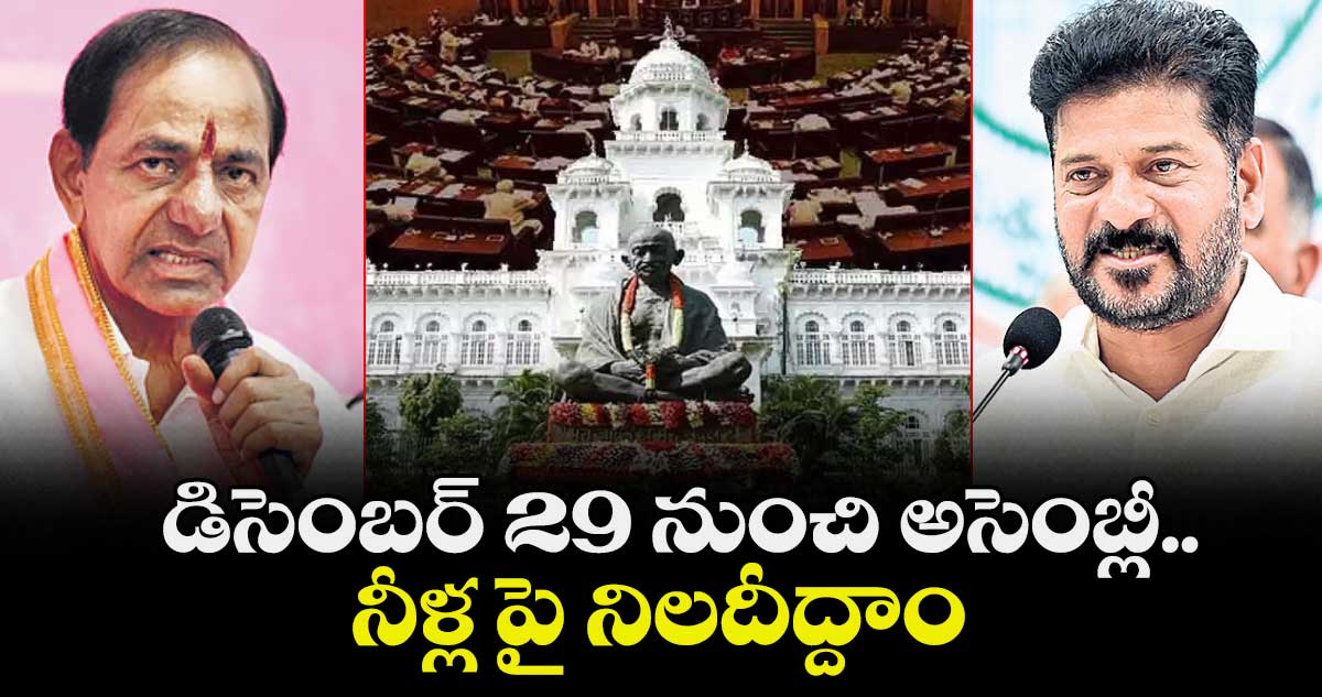 ఈ నెల 29 నుంచి అసెంబ్లీ సమావేశాలు నిర్వహించాలని ప్రాథమికంగా నిర్ణయించిన ప్రభుత్వం, ప్రధానంగా నీళ్ల అంశాన్ని అజెండాగా మార్చుకోనున్నట్టు తెలిసింది. విశ్వసనీయ సమాచారం ప్రకారం.. కృష్ణా, గోదావరి బేసిన్లపై పవర్ పాయింట్ ప్రజెంటేషన్ ద్వారా గత ప్రభుత్వం చేసిన తప్పిదాలను సభ సాక్షిగా ఎండగట్టాలని మంత్రుల భేటీలో నిర్ణయించారు. ఉమ్మడి ఏపీలో తెలంగాణకు జరిగిన అన్యాయంతోపాటు బీఆర్ఎస్ పాలనలో వివిధ ప్రాజెక్టులపై జరిగిన నిర్లక్ష్యాన్ని సాక్ష్యాధారాలతో వివరించనున్నారు. గతంలో కేసీఆర్ అసెంబ్లీలోనే ఏపీకి అనుకూలంగా మాట్లాడిన పాత వీడియోలను ప్రదర్శించడం ద్వారా వారి డబుల్ స్టాండర్డ్స్ ను బయటపెట్టనున్నారు. కేంద్రం వద్ద పెండింగ్లో ఉన్న రాష్ట్ర ప్రాజెక్టుల అంశాలు, ఏపీ అక్రమ ప్రాజెక్టులను అడ్డుకునేందుకు తీసుకుంటున్న చర్యలపై సభలో స్పష్టం చేయనున్నారు. ఉమ్మడి ఏపీ పాలనలో తెలంగాణ నీటి వాటాకు జరిగిన అన్యాయాన్ని, స్వరాష్ట్రంలో బీఆర్ఎస్ ప్రభుత్వం అనుసరించిన విధానాల వల్ల జరిగిన నష్టాన్ని సవివరంగా చర్చించనున్నారు. గత రెండేండ్ల కాంగ్రెస్ పాలనలో సాగునీటి రంగంలో వచ్చిన మార్పులు, పెండింగ్ ప్రాజెక్టుల పూర్తికి తీసుకున్న చర్యలను సభలో వివరించాలని నిర్ణయించారు. కృష్ణా ప్రాజెక్టులను కేఆర్ఎంబీకి అప్పగించే విషయంలో గత ప్రభుత్వ వైఖరిని, ఇప్పుడు తమ ప్రభుత్వం తీసుకుంటున్న చర్యలను వివరించనున్నారు. జలవనరుల వినియోగంలో తెలంగాణ హక్కులను ఎలా కాపాడుతున్నారో గణాంకాలతో సహా నిరూపించేందుకు సిద్ధమయ్యారు.