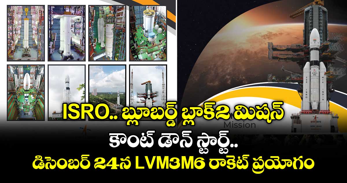 శ్రీహరికోటలోని సతీష్ ధావన్ అంతరిక్ష కేంద్రం నుంచి బ్లూబర్డ్ బ్లాక్-2 మిషన్ కౌంట్ డౌన్ ప్రారంభమైంది. బుధవారం (డిసెంబర్ 24) ఉదయం 8.45 గంటలకు రాకెట్ బ్లూబర్డ్ బ్లాక్ 2ను మోసుకెళ్లే ఇస్రోకు చెందిన LVM3M6 అంతరిక్షంలోకి దూసుకెళ్లనుంది. సతీష్ ధావన్ అంతరిక్ష కేంద్రంలోని రెండో లాంచ్ ప్యాడ్ నుంచి LVM3M6 ను ప్రయోగించనున్నారు. 6వేల 100 కిలోల బరువున్న ఈ శాటిలైట్ ను లో LVM3M6 రాకెట్ లో ఎర్త్ ఆర్బిట్ లో ప్రవేశపెట్టనుంది.