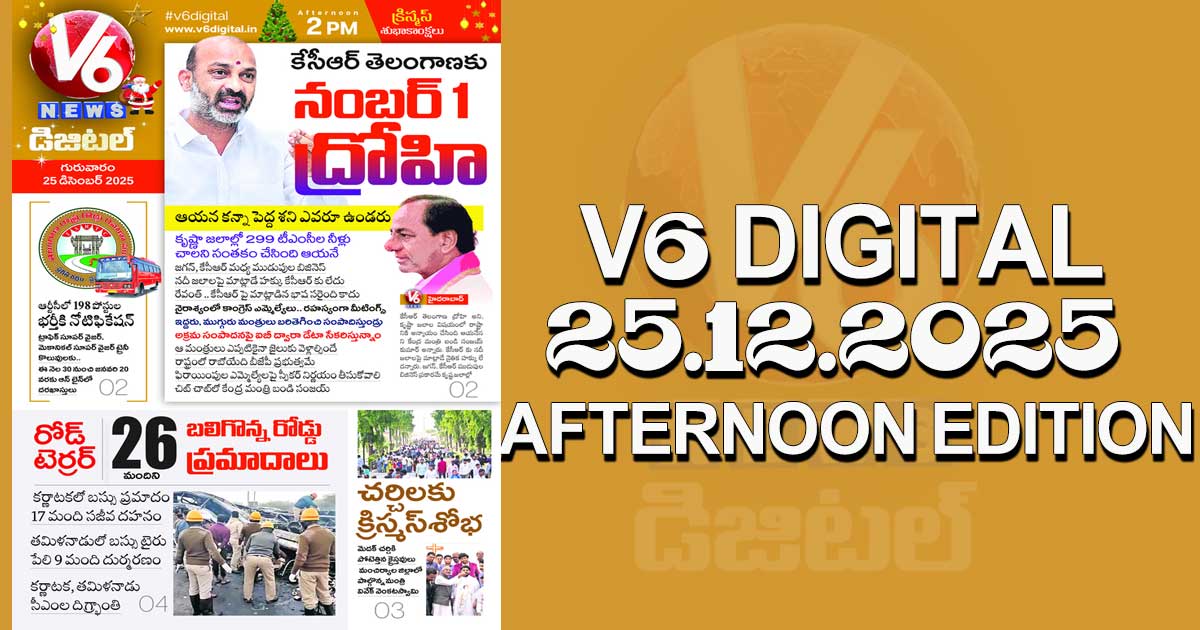 Reading Time: < 1 minute V6 DIGITAL 25.12.2025 AFTERNOON EDITION Caption of Image. ఆ మంత్రులు జైలుకు వెళ్లాల్సిందేనన్న బండి సంజయ్ ఆర్టీసీలో కొలువుల జాతర.. 30 నుంచి దరఖాస్తుల స్వీకరణ రోడ్ టెర్రర్.. తమిళనాడు, కర్ణాటకల్లో 26 మంది మృతి.. ఇంకా మరెన్నో.. క్లిక్ చేయండి Post navigation New Year 2026 : ఉదయం 5 గంటల వరకు హోటళ్లు, రెస్టారెంట్ బార్లు ఓపెన్.. ఎక్కడో తెలుసా..! అలీఘర్ ముస్లిం యూనివర్సిటీలో టీచర్ను కాల్చి చంపేశారు !