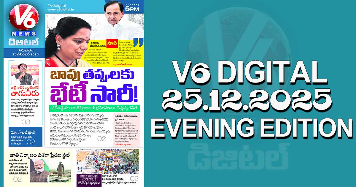 Reading Time: < 1 minute V6 DIGITAL 25.12.2025 EVENING EDITION Caption of Image. బాపు తప్పులకు భేటీ క్షమాపణ..ఊరూరా తిరిగి సారీ చెప్తున్నకవిత రూ.5కే థాలీ..ఢిల్లీలో అటల్ క్యాంటీన్లు ప్రారంభం లక్నోలో 65 అడుగుల వాజ్ పేయి విగ్రహాన్ని ఆవిష్కరించిన మోదీ *ఇంకా మరెన్నో.. క్లిక్ చేయండి* Post navigation ఇండియాలో పదేళ్లలో పెట్రోల్ బంకులు ఏ రేంజ్లో పెరిగాయంటే.. అమెరికా, చైనా తర్వాత మనదే థర్డ్ ప్లేస్ ! పశువుల్లా ఎక్కించడమేంటీ..! శంషాబాద్ ఎయిర్ పోర్టులో సినీ నటుడు నరేష్ గొడవ
