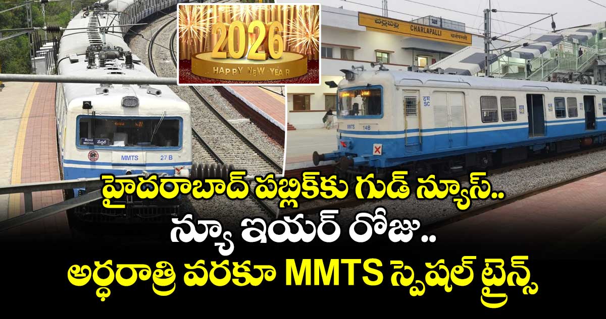 హైదరాబాద్: కొత్త సంవత్సరం సందర్భంగా 2026 జనవరి 1న తెల్లవారుజామున హైదరాబాద్ సిటీలో MMTS స్పెషల్ ట్రైన్స్ నడపాలని దక్షిణ మధ్య నిర్ణయించింది. ఒక MMTS స్పెషల్ ట్రైన్.. లింగంపల్లి నుంచి జనవరి 1న అర్ధరాత్రి 1:15 గంటలకు బయలుదేరి 1:55 గంటలకు నాంపల్లి రైల్వే స్టేషన్ చేరుకుంటుంది.