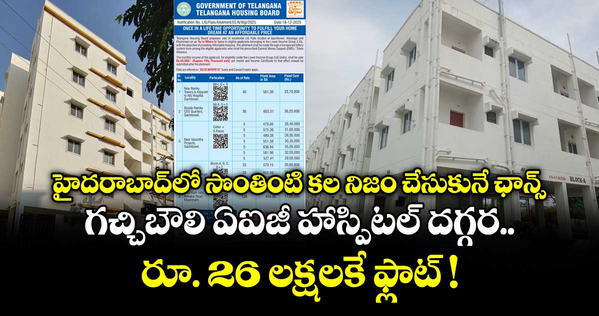 హైదరాబాద్: హైదరాబాద్ సిటీలోని గచ్చిబౌలిలో సొంతింటి కలను నిజం చేసుకోవడం అంటే ప్రస్తుతం ఉన్న ల్యాండ్ ధరలను చూసుకుంటే చిన్న విషయం కాదు. కానీ.. 2026లో కొందరికి ఆ కలను నిజం చేసుకునే అవకాశం వచ్చింది. హైదరాబాద్లోని గచ్చిబౌలి, ఖమ్మం, వరంగల్ ప్రాంతాల్లో మొత్తం 339 ఫ్లాట్లను అమ్మాలని హౌసింగ్ బోర్డు నిర్ణయించింది. తక్కువ ఆదాయ వర్గాలకు (ఎల్ఐజీ) మంచి వసతులతో కూడిన సొంతింటి వసతిని కల్పించాలన్న ఉద్దేశంతో ప్రభుత్వం ఈ ఫ్లాట్లను విక్రయిస్తోంది.
