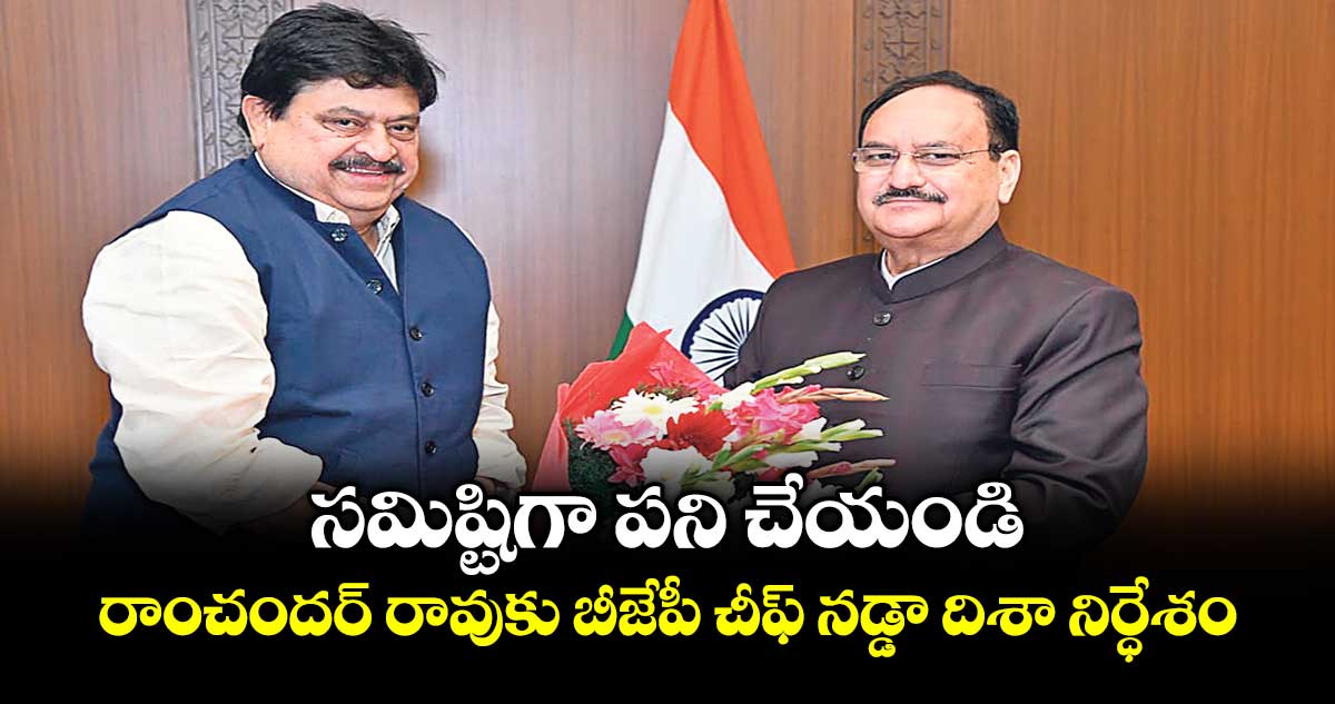 న్యూఢిల్లీ, వెలుగు: తెలంగాణలో బీజేపీ అధికారంలోకి రావాలంటే నేతలంతా సమిష్టిగా పనిచేయాలని బీజేపీ చీఫ్ జేపీ నడ్డా అన్నారు. ఈ మేరకు మంగళవారం తనను కలిసిన పార్టీ రాష్ట్ర అధ్యక్షుడు రాంచందర్ రావుకు నడ్డా దిశానిర్దేశం చేశారు. ఢిల్లీ పర్యటనలో భాగంగా నడ్డాను మర్యాదపూర్వకంగా కలినట్లు రాంచందర్ రావు మంగళవారం ఓ ప్రకటనలో తెలిపారు. ‘ఈ భేటీలో రాజకీయపరమైన, పార్టీ సంస్థగత విషయాలపై చర్చించాం.