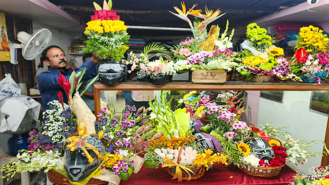 ఇక ప్రముఖ బ్రాండ్ల హెల్మెట్లను వాడి వాటి ధరలకు అనుగుణంగా వినియోగదారుల అభీష్టం మేరకు వివిధ రంగుల పూలు, ఫలాలతో అలంకరించిన బోకేలు, బాస్కెట్లు ప్రత్యేక ఆకర్షణగా నిలుస్తున్నాయి. రెండున్నర దశాబ్దాల పైగా బొకేల తయారీలో ఉన్న బ్లూ పెటల్స్ ఈ ఏడాది హెల్మెట్ బొకే ఆలోచనను శ్రీకారం చుట్టింది. బిజినెస్ తో పాటు సామాజిక బాధ్యతతోనే హెల్మెట్ బోకేలను తయారుచేసామంటున్నారు నిర్వాహకులు.