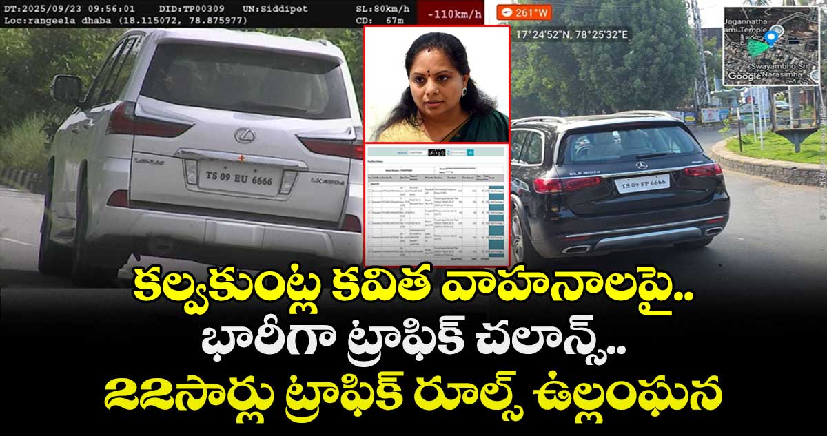 ఎమ్మెల్సీ కల్వకుంట్ల కవిత వాహనాలపై భారీగా ట్రాఫిక్ చలాన్లు దర్శనమిచ్చాయి. కల్వకుంట కవిత వాహనాలు అనేక సార్లు ట్రాఫిక్ రూల్స్ అతిక్రమించినట్లు ట్రాఫిక్ పోలీస్ రికార్డుల్లో నమోదు అయ్యింది. శుక్రవారం శాసన మండలి సమావేశాలకు వచ్చిన కవిత మార్సిడెస్ బెంజ్ కారుపై 6 చలాన్లు ఉన్నట్లు గుర్తించారు. ఏకంగా 22 సార్లు ట్రాఫిక్ నిబంధనలు ఉల్లంఘించినట్లు ట్రాఫిక్ పోలీస్ రికార్డులు చెబుతున్నాయి.