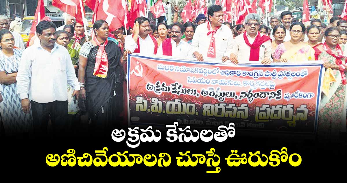 మధిర, వెలుగు: గ్రామపంచాయతీ ఎన్నికల్లో సీపీఎం అభ్యర్థులు గెలిచిన నేపథ్యంలో తమ నాయకులు, కార్యకర్తలపై అక్రమ కేసులు బనాయించి అక్రమంగా పోలీసులు అరెస్టులు చేస్తున్నారని, అక్రమ కేసులతో అణిచివేయాలని చూస్తే ఊరుకోబోమని సీపీఎం రాష్ట్ర కార్యదర్శి జాన్వెస్లీ అన్నారు. ఇదే విషయాన్ని నిరసిస్తూ శనివారం మధిర పట్టణంలో సీపీఎం పార్టీ ఆధ్వర్యంలో ప్రదర్శన చేపట్టారు. ఈ సందర్భంగా ఆయన మాట్లాడుతూ డిప్యూటీ సీఎం మల్లు భట్టి విక్రమార్క తన ఉనికి కోల్పోతుందని, తన బలం తగ్గిపోతుందని, వచ్చే ఎన్నికల్లో ఇబ్బందులు తలెత్తుతాయని పీపీఎం నాయకులపై అక్రమ కేసులు పెట్టించి మధిర నియోజకవర్గంలో 13 మందిని జైలుకు పంపారని ఆరోపించారు.