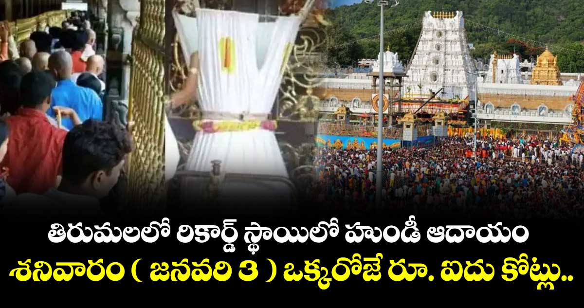 కలియుగ వైకుంఠం తిరుమలలో వైకుంఠ ద్వార దర్శనాలు వైభవంగా కొనసాగుతున్నాయి. రికార్డు స్థాయిలో తిరుమల శ్రీవారిని దర్శించుకుంటున్నారు భక్తులు. కొత్త ఏడాది ప్రారంభం నుంచి స్వామివారి దర్శనం కోసం దేశం నలుమూలల నుంచి భారీ సంఖ్యలో భక్తులు తరలి వస్తున్నారు. ఈ క్రమంలో రికార్డ్ స్థాయిలో హుండీ ఆదాయం వచ్చినట్లు తెలిపారు టీటీడీ అధికారులు .భక్తుల సంఖ్య పెరిగినట్లే హుండీ ఆదాయం కూడా భారీగా పెరిగిందని… ఈ ఏడాది ప్రారంభంలోనే తిరుమల శ్రీవారి హుండీ ఆదాయం రూ.5 కోట్ల మార్కును దాటడం విశేషమని తెలిపారు అధికారులు.