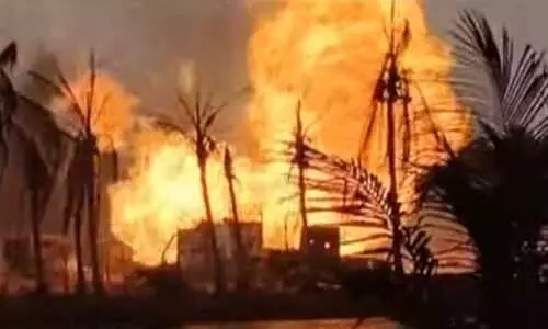 అమరావతి: కోనసీమ జిల్లా మలికిపురం మండలం ఇరుసుమండలంలో భారీ అగ్నిప్రమాదం జరిగింది. ఒఎన్ జిసి పైప్ లైన్ నుంచి గ్యాస్ లీక్ అయ్యి మంటలు ఎగసిపడ్దాయి. మంటల ధాటికి ఒఎన్ జిసి సిబ్బంది, గ్రామస్తులు భయాందోళనతో పరుగులు పెట్టారు. ఇరుసుమండ గ్రామాన్ని పొగకమ్మేసింది. వందలాది కొబ్బరి చెట్లు కాలిపోయాయి. సమీప గ్రామాలను అధికారులు ఖాళీ చేయిస్తున్నారు. లక్కవరం కల్యాణమండపానికి 300 కుటుంబాలు తరలించారు. సంఘటనా స్థలిని జిల్లా కలెక్టర్ పరిశీలించగా.. సహాయక చర్యలు వేగవంతం చేయాలని ఆదేశం ఇచ్చారు. మంటలను అదుపు చేసేందుకు ఒఎన్ జిసి అధికారులు యత్నించారు.