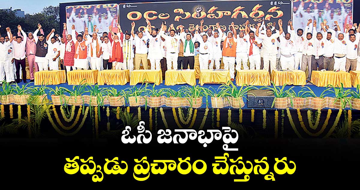 వరంగల్, వెలుగు : ‘రాష్ట్రంలో ఓసీ జనాభా 10 శాతమే ఉందని తప్పుడు ప్రచారం చేస్తున్నరు.. రెడ్డి, వెలమ, కమ్మ, వైశ్య, బ్రాహ్మణ, మార్వాడి సామాజికవర్గాలు కలుపుకొని మొత్తం 30 శాతం జనాభా ఉన్నాం’ అని ఓసీ జేఏసీ రాష్ట్ర అధ్యక్షుడు గోపు జయపాల్రెడ్డి చెప్పారు. ఓసీల్లోని పేదలు తీవ్ర అన్యాయానికి గురవుతున్నారని.. పోరాడి హక్కులను సాధించుకోవాలని సూచించారు. హనుమకొండలోని ఆర్ట్స్ అండ్ సైన్స్ కాలేజీ గ్రౌండ్లో ఆదివారం ఓసీల సింహగర్జన కార్యక్రమం నిర్వహించారు.