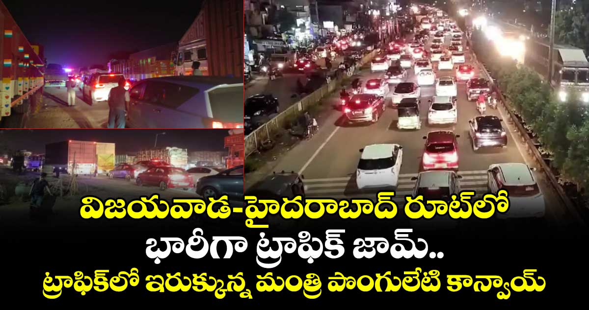 వాహనాల రద్దీ పెరగడంతో పెద్ద కాపర్తి దగ్గర హైదరాబాద్ వచ్చే వాహనాలు ఆపి.. రెండు రూట్లలో విజయవాడ వైపు వెళ్లే వాహనాలను పంపించారు పోలీసులు. దీంతో హైదరాబాద్ రూట్లో భారీగా వాహనాలు నిలిచిపోయాయి. ఈ క్రమంలోనే హైదరాబాద్ వెళ్తున్న మంత్రి పొంగులేటి శ్రీనివాస్ రెడ్డి కాన్వాయ్ ట్రాఫిక్లో చిక్కుకుపోయింది.