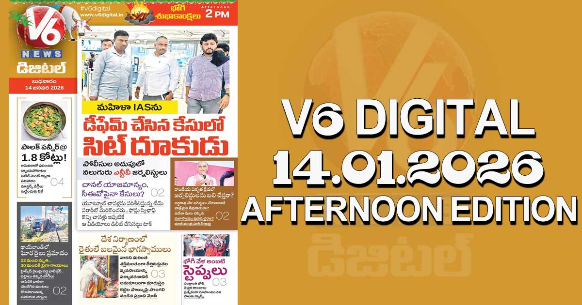 Reading Time: < 1 minute V6 DIGITAL 14.01.2026 AFTERNOON EDITION Caption of Image. నలుగురు జర్నలిస్టులను అరెస్టు చేసిన సిట్.. కారణం ఇదే! పాలక్ పన్నీరా మజాకా..? 1.80 కోట్ల పరిహారం ఇప్పించింది.. భోగి వేళ డ్యాన్స్ చేసిన మాజీ మంత్రి.. ఫుల్ జోష్ లో కేడర్! ఇంకా మరెన్నో.. క్లిక్ చేయండి Post navigation ఆధ్యాత్మికం : 18న ఆదివారం మౌని అమావాస్య.. పంచగ్రహ కూటమి కూడా.. మంచి రోజా.. చెడ్డ రోజునా.. పోలీస్ కారును బాంబులతో పేల్చేశారు : పాకిస్తాన్ టెర్రరిస్ట్ గ్రూపు వీడియో రిలీజ్