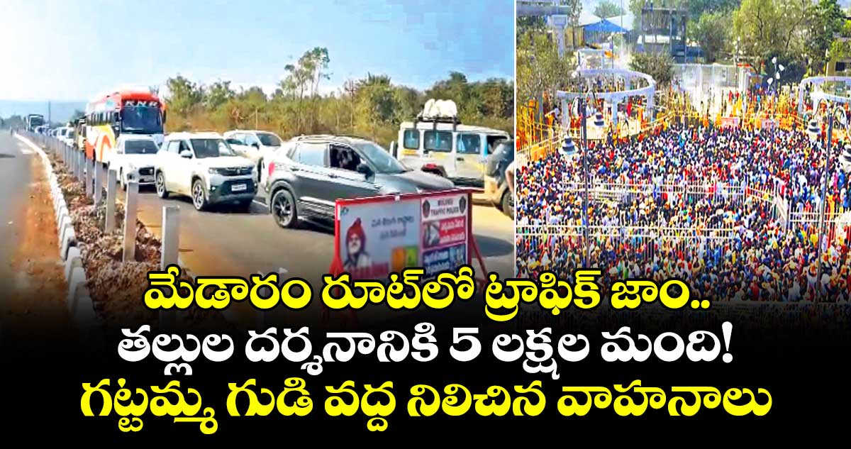 వాహనాలు డైవర్ట్ చేసి ఎప్పటికప్పుడు అధికారులు క్లియర్ చేస్తు న్నారు. తాడ్వాయి వైపు, పస్రా వైపు మార్గాల నుంచి కూడా భారీ సంఖ్యలో వాహనాలు బారులు తీరాయి. మేడారానికి నాలుగు లైన్ల రోడ్డు నిర్మించినప్పటికీ భక్తులు బాగా తరలివ స్తుండటంలో ట్రాఫిక్ జాం ఏర్పడింది. అంచ నాలకు మించి భక్తులు వస్తుండటంతో ఈ పరి స్థితి నెలకొంది. ఇవాళ ఒక్క రోజే ఐదు లక్షల మంది సమ్మక్క, సారలమ్మను దర్శించుకునేందుకు వచ్చినట్టు అధికారులు చెబుతున్నారు.