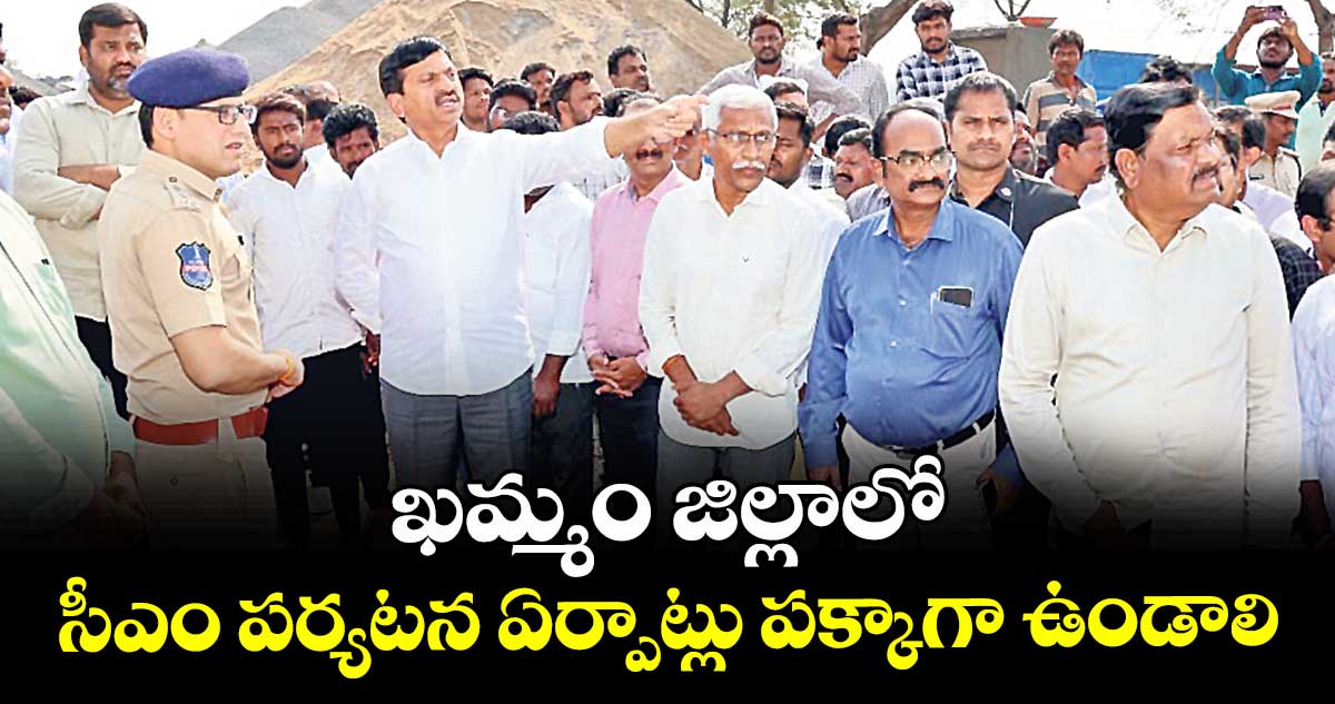 ఖమ్మం రూరల్, వెలుగు : రేపు ఖమ్మం జిల్లాలో ముఖ్యమంత్రి పర్యటన ఖరారైందని, అవసరమైన ఏర్పాట్లన్నీ పక్కాగా చేపట్టాలని మంత్రి పొంగులేటి శ్రీనివాస రెడ్డి అధికారులను ఆదేశించారు. శుక్రవారం మద్దులపల్లి నర్సింగ్ కళాశాల వద్ద జిల్లా ఇన్చార్జి కలెక్టర్ డాక్టర్ పీ.శ్రీజ, ఖమ్మం పోలీస్ కమిషనర్ సునీల్ దత్, అడిషనల్ కలెక్టర్ పీ.శ్రీనివాసరెడ్డితో కలిసి ఆయన సీఎం పర్యటన ఏర్పాట్లను పరిశీలించారు.