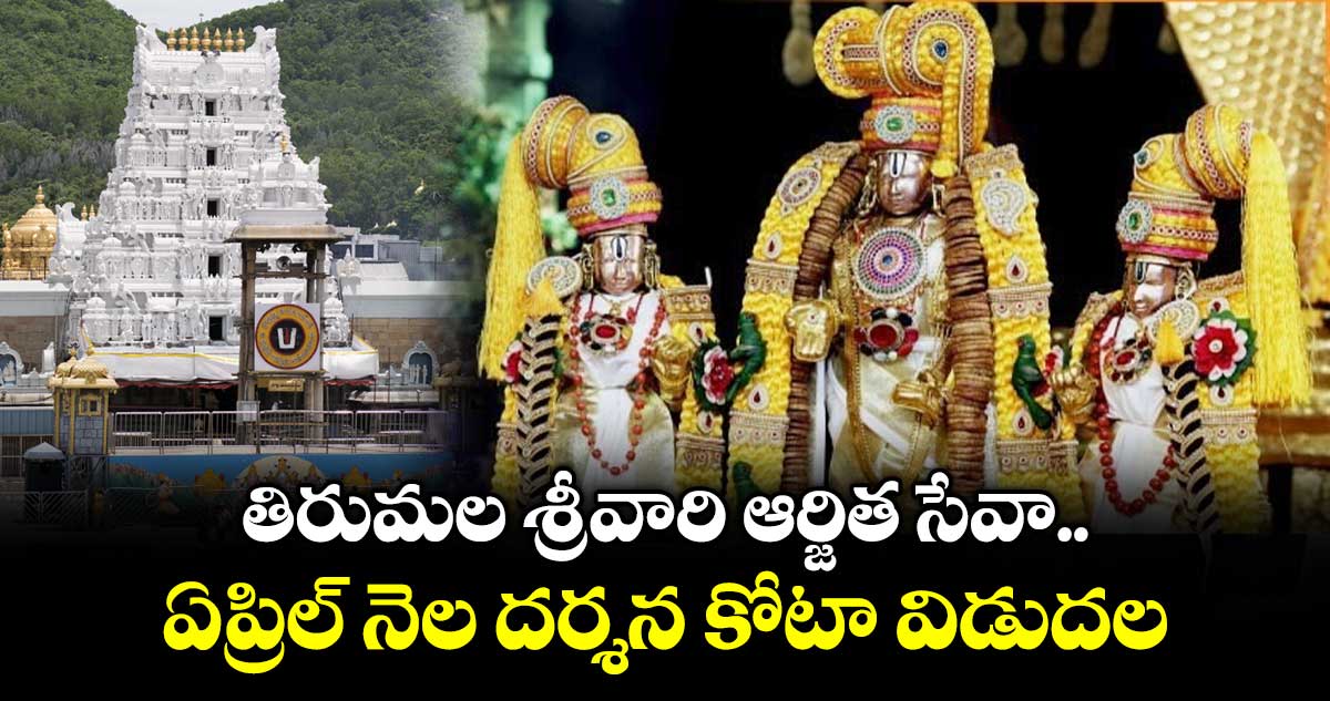 తిరుమల శ్రీవారి ఆర్జిత సేవా టికెట్లు (సుప్రభాతం, తోమాల, అర్చన, అష్టదళ పాదపద్మారాధన సేవ) ఏప్రిల్ నెలకు సంబంధించిన కోటాను జనవరి 19న ఉదయం 10 గంటలకు టీటీడీ ఆన్లైన్లో విడుదల చేయనుంది.
