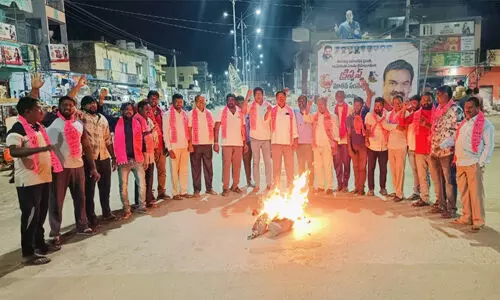 మోత్కూర్: బిఆర్ఎస్ అధినేత, మాజీ ముఖ్యమంత్రి కెసిఆర్ పై అనుచిత వ్యాఖ్యలు చేసిన ముఖ్యమంత్రి రేవంత్ రెడ్డి దిష్టి బొమ్మను బిఆర్ఎస్ నాయకులు దహనం చేశారు. ఈ సందర్బంగా మాజీ మార్కెట్ కమిటీ మాజీ చేర్మెన్ కొణతం యాకుబ్ రెడ్డి, మండలపార్టీ అధ్యక్షులు పొన్నేబోయిన రమేష్ లు మాట్లాడుతూ.. తెలంగాణ రాష్టంలో బిఆర్ఎస్ గద్దెలను కులగొట్టాలని ఒక వీధి రౌడీల్లా మాట్లాడుతున్నావని, రేవంత్ రౌడీవా? రాష్టానికి ముఖ్యమంత్రివా? అంటూ విమర్శలు గుప్పించారు. దిమ్మెలను కులగొట్టగలవేమోగాని ప్రజలగుండెల్లో ఉన్న గులాబీ జేండను చేరపలేవని, ముఖ్యమంత్రి మాటాల ద్వారానే అర్ధమవుతుందని, ఆంధ్ర బ్రోకర్ అని, చంద్రబాబు తొత్తువు అని మండిపడ్డారు. రాక్షసుల గురువు, రేవంత్ కలిసి తెలంగాణ రాష్టాన్ని పీక్కుతింటున్నారని యాకుబ్ రెడ్డి దుయ్యబట్టారు.