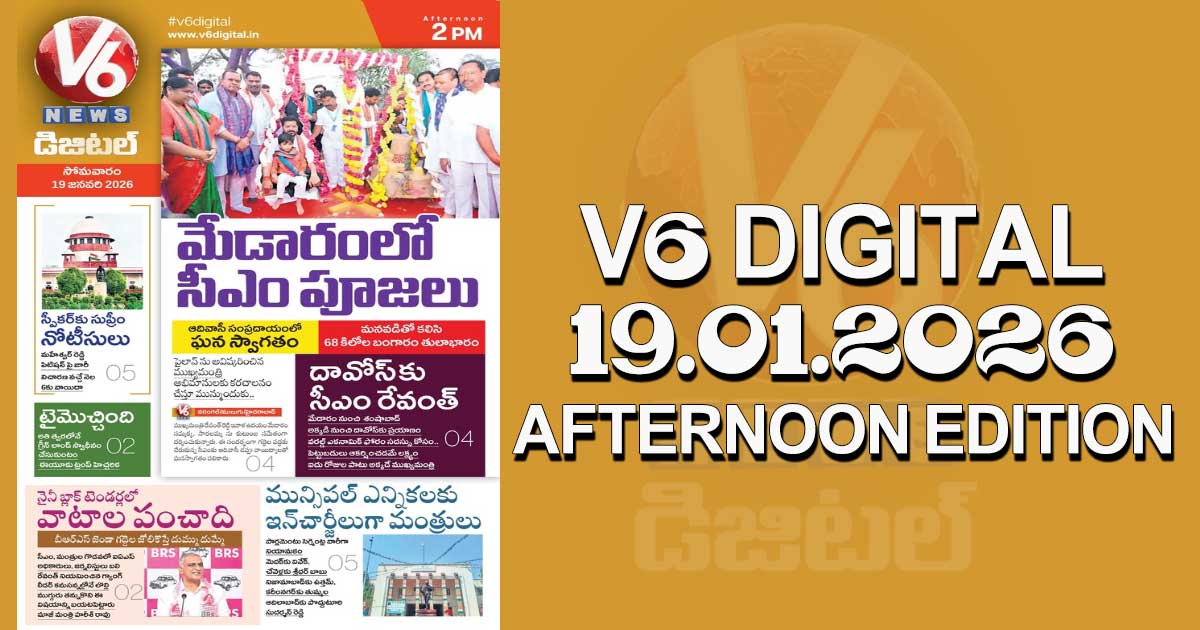 Reading Time: < 1 minute V6 DIGITAL 19.01.2026 AFTERNOON EDITION Caption of Image. మేడారంలో సీఎం పూజలు.. కుటుంబంతో కలిసి మొక్కులు స్పీకర్ కు సుప్రీం కోర్టు ధిక్కార నోటీసులు.. ఏ కేసులో నంటే? మున్సిపల్ ఎన్నికలకు ఇన్ చార్జిలుగా మంత్రులు.. ఎక్కడికి ఎవరంటే? ఇంకా మరెన్నో.. క్లిక్ చేయండి Post navigation PTV vs SNGPL: 232 సంవత్సరాల రికార్డ్ బ్రేక్.. 40 పరుగుల టార్గెట్ను కాపాడుకొని చరిత్ర సృష్టించిన జట్టు Mrunal Thakur: ధనుష్తో పెళ్లిపై మృణాల్ క్లారిటీ.. సముద్రంలో చిల్ అవుతూ స్టైలిష్ కౌంటర్!