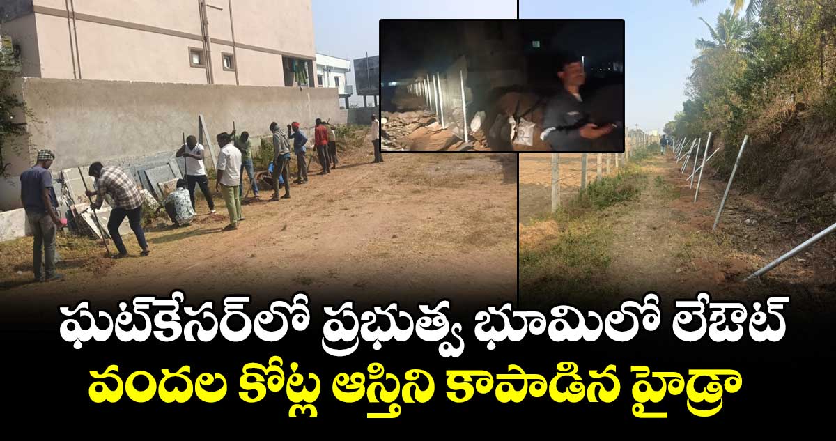 ఆక్రమణలపై హైడ్రా మరోసారి పంజా విసిరింది. ప్రభుత్వ భూమిని ఆక్రమించి వేసిన లేఔట్లను తొలగించి వందల కోట్ల విలువైన స్థలాన్ని కాపాడింది. సోమవారం (జనవరి 19) మేడ్చల్ – మల్కాజిగిరి జిల్లా ఘట్ కేసర్ మండలంలో ఆక్రమణలు తొలగించి ఫెన్సింగ్ వేసింది. ఏడాది క్రితం అడ్డు గోడలు తొలగించిన అదే ప్రాంతంలో లేఔట్లు వేయటంతో యాక్షన్ లోకి దిగిన హైడ్రా.. ప్రభుత్వ భూమిని స్వాధీనం చేసుకుంది.