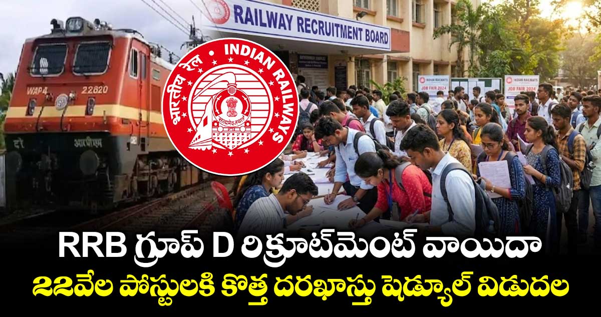RRB Group D Recruitment 2026: రైల్వే రిక్రూట్మెంట్ బోర్డు 22వేల RRB గ్రూప్ D పోస్టుల దరఖాస్తు ప్రక్రియను వాయిదా వేసింది. మొదట్లో దరఖాస్తుల ప్రక్రియ జనవరి 21న ప్రారంభం కావాల్సి ఉండగా, ఇప్పుడు జనవరి 31కి వాయిదా పడింది. దింతో రైల్వే రిక్రూట్మెంట్ బోర్డు కొత్తగా సవరించిన షెడ్యూల్ ప్రకారం, రిజిస్ట్రేషన్ ప్రక్రియ జనవరి 31 నుండి మొదలై మార్చి 2 రాత్రి 11:59 గంటల వరకు ఉంటుంది. అభ్యర్థులు అధికారిక వెబ్సైట్ rrb.gov.inని ద్వారా ఆన్లైన్లో దరఖాస్తు చేసుకోవచ్చు.