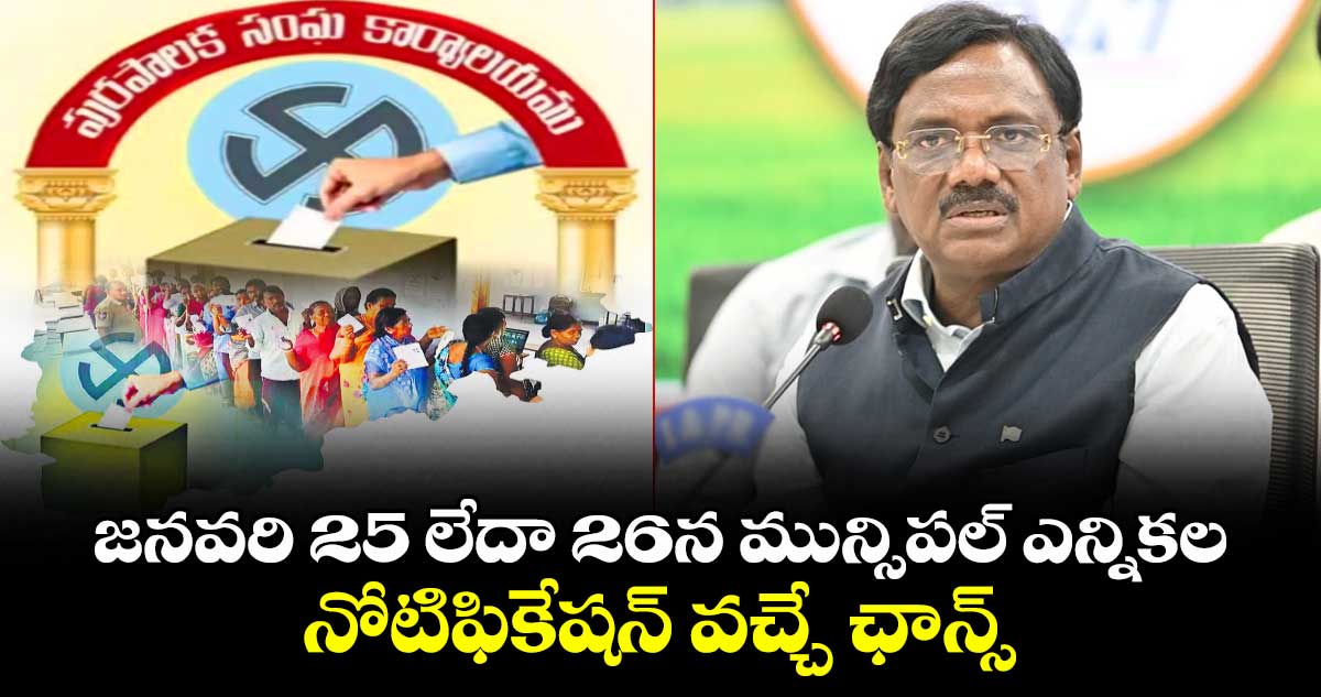 హైదరాబాద్: జనవరి 25 లేదా 26న మున్సిపల్ ఎన్నికల నోటిఫికేషన్ వచ్చే అవకాశం ఉందని మంత్రి వివేక్ వెంకటస్వామి అన్నారు. మంగళవారం (జనవరి 20) నర్సాపూర్లో జరిగిన మున్సిపల్ ఎన్నికల సన్నాహక సమావేశంలో ఆయన పాల్గొన్నారు. ఎన్నికల్లో అనుసరించాల్సిన వ్యూహాలపై కేడర్కు దిశానిర్దేశం చేశారు. ఈ సందర్భంగా ఆయన మాట్లాడుతూ.. అన్ని అంశాలను పరిగణలోకి తీసుకుని అభ్యర్థులను ఎంపిక చేస్తామని తెలిపారు.