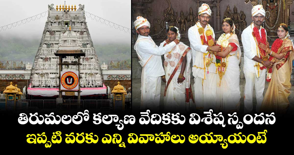 తిరుమల కల్యాణవేదికకు నూతన వధూవరుల నుండి విశేష స్పందన వస్తోందని తెలిపింది టీటీడీ. టీటీడీ 2016 ఏప్రిల్ 25వ తేదీ నుండి తిరుమల పాపావినాశనం రోడ్డులోని కళ్యాణ వేదిక దగ్గర ఉచిత వివాహాలు నిర్వహిస్తున్న సంగతి తెలిసిందే. కల్యాణ వేదికలో 2016 ఏప్రిల్ 25 నుండి 2025 డిసెంబర్ 31వ తేదీ వరకు దాదాపు 26,777 వివాహాలు నిర్వహించినట్లు తెలిపింది టీటీడీ. ఇందులో భాగంగా పురోహితుడు, మంగళవాయిద్యంతో పాటు పెళ్లి సమయంలో పసుపు, కుంకుమ, కంకణంను ఉచితంగా అందిస్తుంది టీటీడీ.