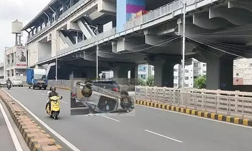 బేగంపేట: హైదరాబాద్ లోని బేగంపేట ఫ్లై ఓవర్ పై రోడ్డు ప్రమాదం చోటుచేసుకుంది. బుధవారం తెల్లవారుజామున ఫ్లైఓవర్ మధ్యలో డివైడర్ ను కారు ఢీకొట్టడంతో పల్టీ కొట్టి బోల్తా పడింది. ఈ ప్రమాదంలో డ్రైవర్ తీవ్రంగా గాయపడడంతో ఆస్పత్రికి తరలించారు. కారు సికింద్రాబాద్ నుంచి పంజాగుట్ట వైపు వెళ్తుండగా ఆ ప్రమాదం జరిగింది. రోడ్డు అడ్డంగా కారు పడడంతో రెండు కిలో మీటర్ల మేర ట్రాఫిక్ జామ్ ఏర్పడింది. పోలీసులు ఘటనా స్థలానికి చేరుకొని సహాయక చర్యలు చేపట్టారు. క్రేన్ సహాయంతో వాహనాన్ని పక్కకు తొలగిస్తున్నారు. ఇంకా వివరాలు తెలియాల్సి ఉంది.