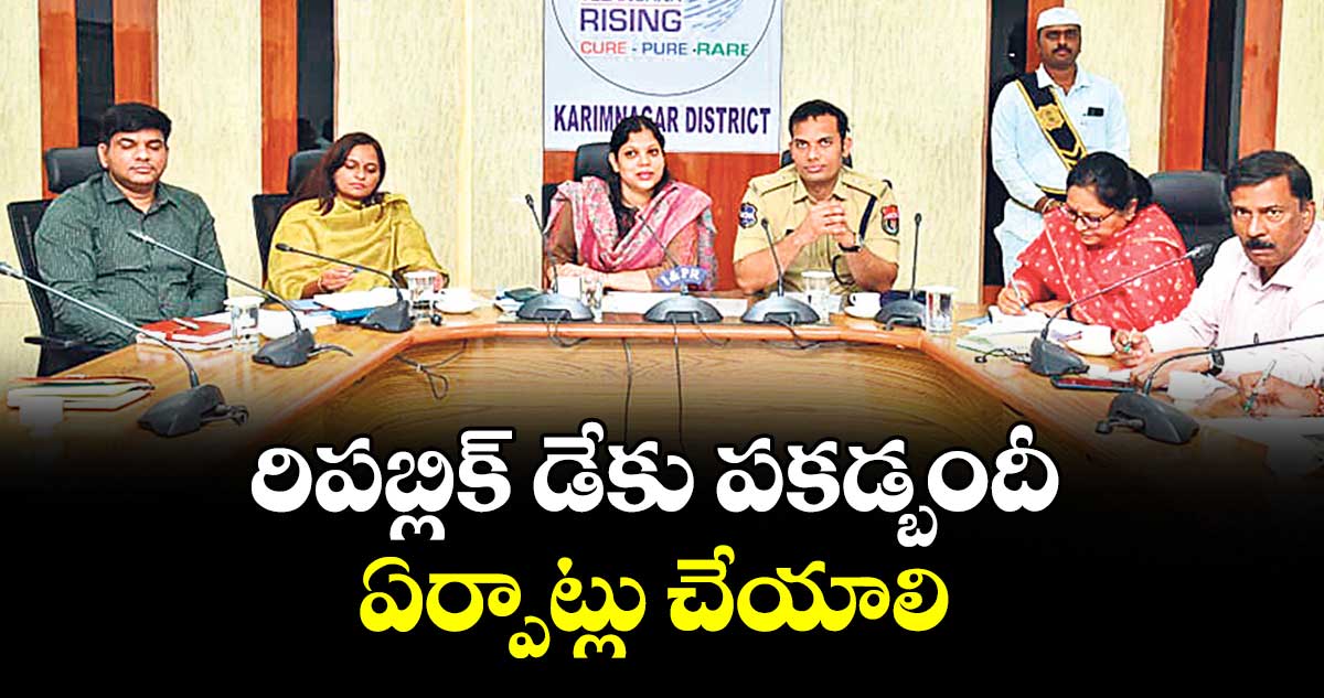 కరీంనగర్ టౌన్,వెలుగు: జనవరి26న పోలీస్ పరేడ్ గ్రౌండ్లో నిర్వహించనున్న రిపబ్లిక్ డే వేడుకలకు పక్కగా ఏర్పాట్లు చేయాలని కలెక్టర్ పమేలా సత్పతి ఆదేశించారు. మంగళవారం రిపబ్లిక్ డే వేడుకలపై కలెక్టరేట్లో సీపీ గౌష్ ఆలంతో కలిసి మీటింగ్ నిర్వహించారు. ఈ సందర్భంగా ఆమె మాట్లాడుతూ రిపబ్లిక్ డేకు వేదిక, పార్కింగ్, విద్యుత్, అలంకరణ, సౌండ్ సిస్టం, తాగునీరు తదితర ఏర్పాట్లను వెంటనే పూర్తి చేయాలని అన్నారు.
