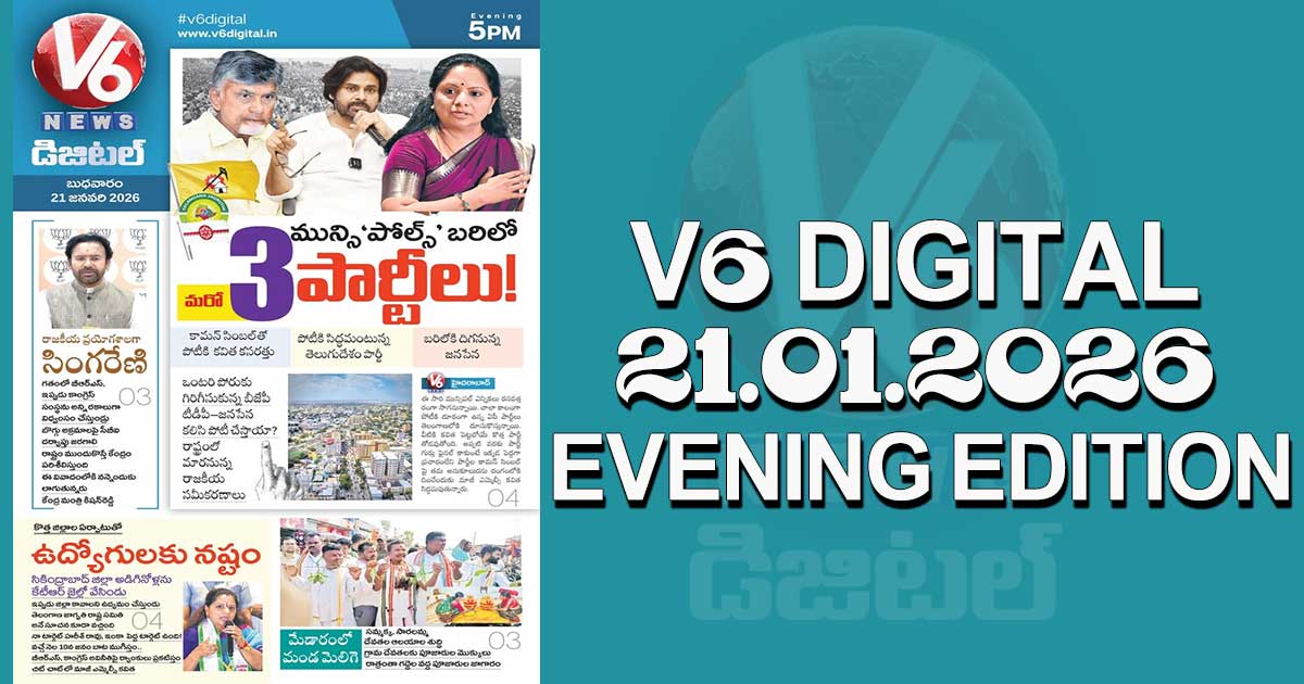 Reading Time: < 1 minute V6 DIGITAL 21.01.2026 EVENING EDITION Caption of Image. మున్సిపల్ ఎన్నికల్లో మరో మూడు పార్టీల పోటీ? ఏవంటే? మేడారంలో మండ మెలిగె..శుద్ధితో జాతర ప్రారంభం ఐసీసీ వన్డే ర్యాంకింగ్స్ విడుదల..ఎవరు ఏ స్థానంలో ఉన్నారంటే? *ఇంకా మరెన్నో.. క్లిక్ చేయండి* Post navigation దావోస్ లో సీఎం రేవంత్ రెడ్డి.. టాటా చైర్మన్ నటరాజన్ చంద్రశేఖరన్తో కీలక భేటీ BPL 2025: చివరి బంతికి ఆరు పరుగులు.. సిక్సర్ కొట్టి మ్యాచ్ గెలిపించిన ఇంగ్లాండ్ ప్లేయర్.. వీడియో వైరల్
