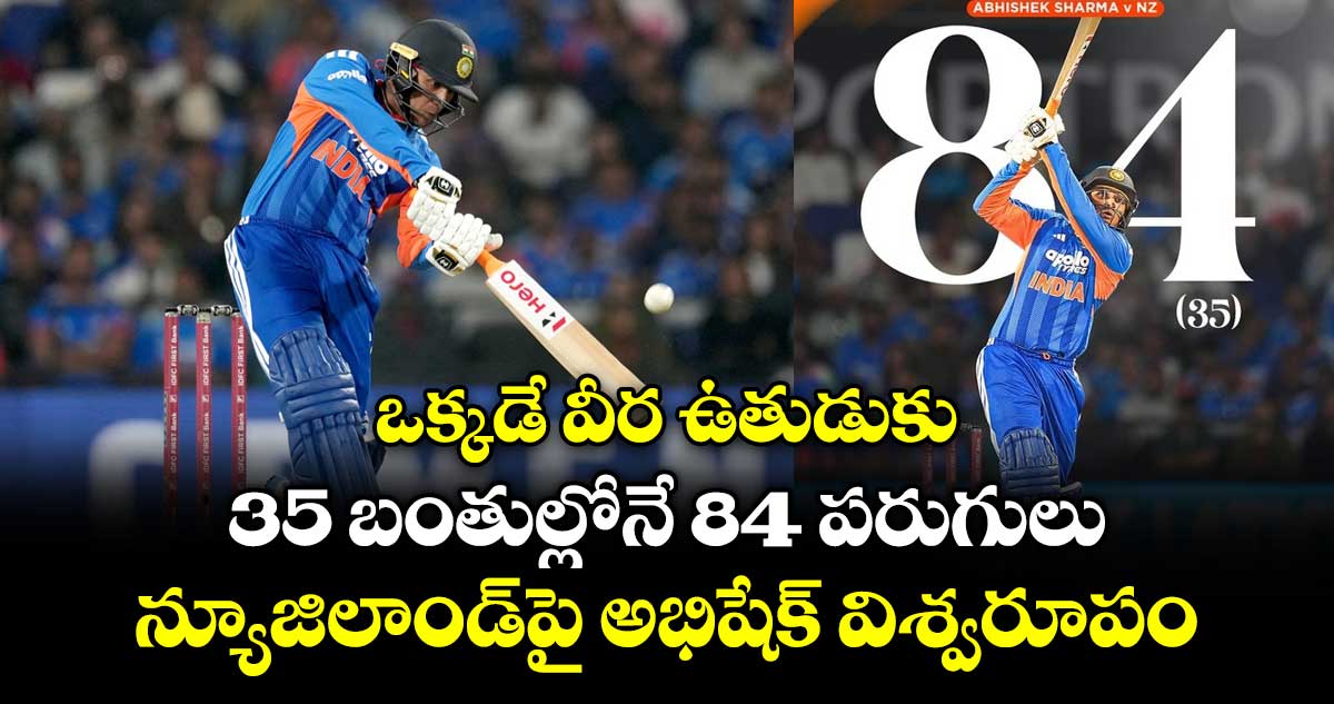 టీమిండియా ఓపెనర్ అభిషేక్ శర్మ న్యూజిలాండ్ తో జరుగుతున్న తొలి టీ20లో విధ్వంసం సృష్టించాడు. నాగ్ పూర్ వేదికగా బుధవారం (జనవరి 21) విదర్భ క్రికెట్ అసోసియేషన్ స్టేడియంలో జరుగుతున్న ఈ మ్యాచ్ లో న్యూజిలాండ్ టాస్ గెలిచి బౌలింగ్ ఎంచుకుంది. దీంతో ఇండియా మొదట బ్యాటింగ్ చేస్తోంది. ఎప్పటి లాగే ఓపెనర్ అభిషేక్ శర్మ దుమ్ములేపాడు. కివీస్ బౌలర్లకు చుక్కలు చూపిస్తూ ఆటాడుకున్నాడు. కేవలం 35 బంతుల్లోనే 84 పరుగులు చేసి విధ్వంసకర ఇన్నింగ్స్ ఆడాడు. అభిషేక్ ఇన్నింగ్స్ లో 5 ఫోర్లతో పాటు 8 సిక్సర్లున్నాయి.