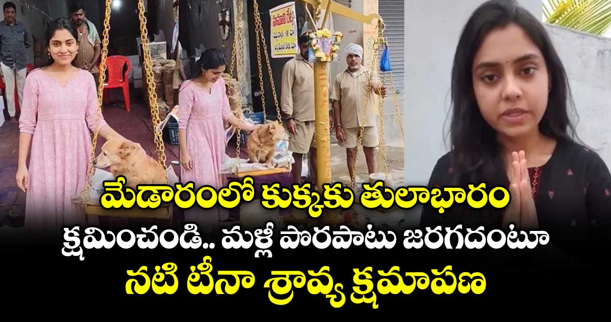 హైదరాబాద్: హీరోయిన్ టీనా శ్రావ్య మేడారంలో తన పెంపుడు కుక్క తులాభారం వేసి బంగారాన్ని (బెల్లం) సమర్పించిన విషయం తెలిసిందే. శక్తివంతమైన సమ్మక, సారలమ్మల దగ్గర కుక్క తులాభారం సమర్పించడం తీవ్ర వివాదస్పదంగా మారింది. ఈ చర్య వన దేవతలను అవమానించడమేనని నటిపై పలువురు ఆగ్రహం వ్యక్తం చేశారు. వివాదం చిలికిచిలికి గాలి వానలా మారుతుండటంతో దీనిపై ఎట్టకేలకు నటి టీనా శ్రావ్య స్పందించింది.