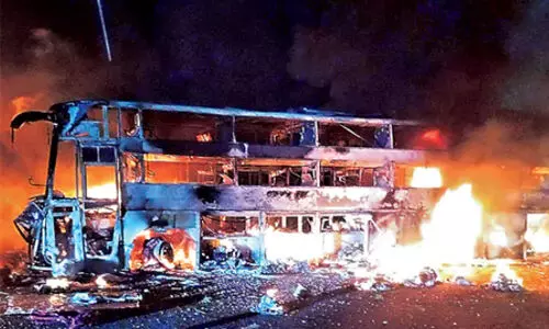 అమరావతి: ఓ ప్రైవేటు బస్సు టైర్ పేలడంతో అదుపుతప్పి డివైడర్ దాటి అవతలి వైపు లారీని ఢీకొట్టడంతో ముగ్గురు మృతి చెందారు. రెండు వాహనాలు దహనమయ్యాయి. ఈ సంఘటన ఆంధ్రప్రదేశ్ రాష్ట్రం నంద్యాల జిల్లా శిరివేళ్ల మండలంలో జరిగింది. పోలీసులు తెలిపిన వివరాల ప్రకారం… ఎఆర్బిసివిఆర్ ప్రైవేటు ట్రావెల్స్ బస్సు 36 మంది ప్రయాణికులతో నెల్లూరు నుంచి హైదరాబాద్కు వెళ్తోందిజ శిరివెళ్లమెట్ట వద్ద రాగానే బస్సు టైరు పేలడంతో అదుపుతప్పి డివైడర్ను ఢీకొట్టి అనంతరం లారీని ఢీకొట్టింది.