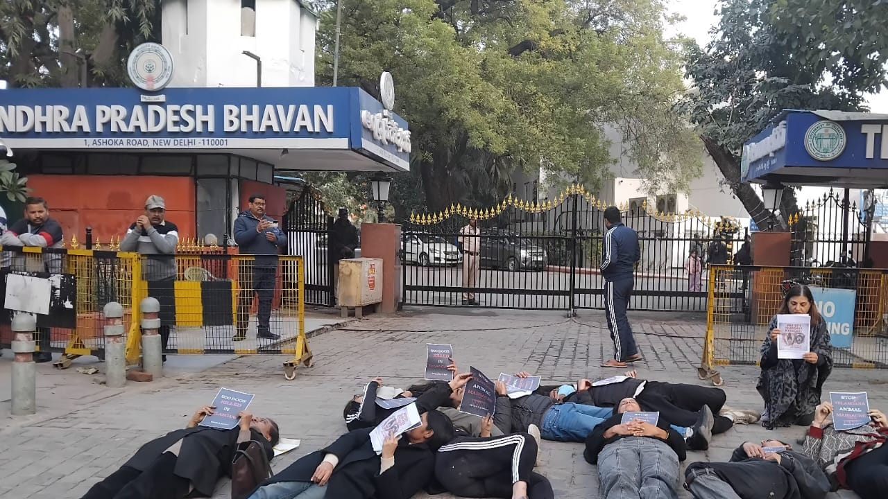 తెలంగాణలో కుక్కలు,కోతులను చంపేస్తున్నారని, మూగ జీవాలను చంపొద్దంటూ జంతు ప్రేమికులు ఢిల్లీ తెలంగాణ భవన్ ఎదుట ఆందోళన వ్యక్తం చేశారు. పీపుల్ ఫర్ ఇండియా ఆధ్వర్యంలో జంతు ప్రేమికులు రోడ్డుపై పడుకుని నిరసన తెలిపారు.