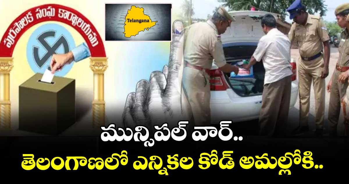 తెలంగాణలో ఎన్నికల కోడ్ అమల్లోకి వచ్చింది. రాష్ట్ర ఎన్నికల కమిషన్ మున్సిపల్ ఎన్నికలకు షెడ్యూల్ విడుదల చేయడంతో రాష్ట్ర వ్యాప్తంగా 116 మున్సిపాలిటీలు, 7 కార్పొరేషన్ల పరిధిలో ఎన్నికల కోడ్ అమల్లో ఉంటుంది. ఫిబ్రవరి 16 వరకు ఎన్నికల కోడ్ అమల్లో ఉండనుంది. ఎన్నికల కోడ్ అమలుతో ప్రభుత్వ పథకాలు ప్రకటన, బదిలీలపై నిషేదం ఉంటుంది .