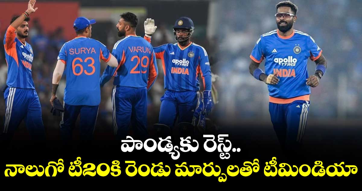 నాలుగో టీ20లో ఇండియా రెండు మార్పులతో బరిలోకి దిగే అవకాశాలు కనిపిస్తున్నాయి. స్టార్ ఆల్ రౌండర్ హార్దిక్ పాండ్యకు నాలుగో టీ 20లో రెస్ట్ ఇవ్వనున్నట్టు తెలుస్తుంది. పాండ్య బెంచ్ కు పరిమితమైతే స్పెషలిస్ట్ స్పిన్నర్ వరుణ్ చక్రవర్తి ప్లేయింగ్ 11లోకి వచ్చే ఛాన్స్ ఉంది. శ్రేయాస్ అయ్యర్ రూపంలో బ్యాటింగ్ ఆప్షన్ ఉన్నప్పటికీ అయ్యర్ వరల్డ్ కప్ స్క్వాడ్ లో లేకపోవడంతో అవకాశం దక్కడం కష్టంగానే కనిపిస్తుంది. నాలుగో టీ20 ఆడే స్టార్ ఫాస్ట్ బౌలర్ జస్ప్రీత్ బుమ్రాకు కూడా నాలుగో టీ20లో పని భారం కారణంగా రెస్ట్ ఇచ్చే అవకాశాలు ఉన్నాయి. బుమ్రా స్థానంలో అర్షదీప్ సింగ్ తుది జట్టులోకి రానున్నాడు.