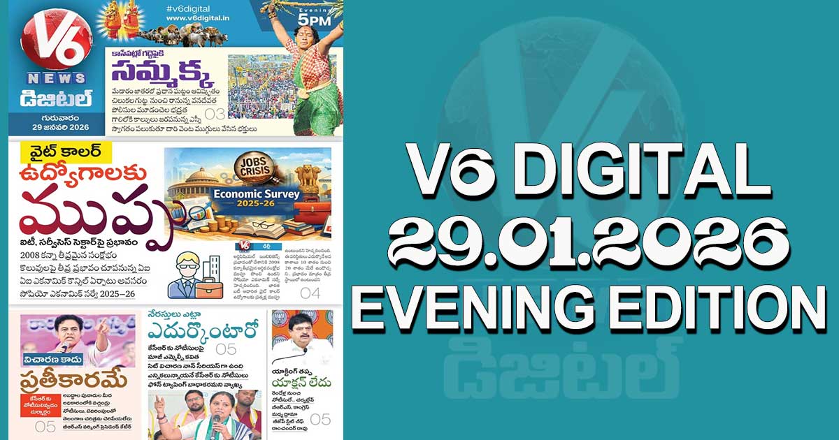 Reading Time: < 1 minute V6 DIGITAL 29.01.2026 EVENING EDITION Caption of Image. కేసీఆర్ కు నోటీసులపై కవిత సంచలన వ్యాఖ్యలు 2008 నాటి ఆర్థిక సంక్షోభం రాబోతోందన్న ఆర్థిక సర్వే కాసేపట్లో గద్దెపైకి సమ్మక్క.. జాతరలో ప్రధాన ఘట్టం ఆవిష్కృతం *ఇంకా మరెన్నో.. క్లిక్ చేయండి* Post navigation నెలంతా పనిచేస్తే గిగ్ వర్కర్లకు రూ.15వేలు కూడా రావట్లే.. మార్పు అవసరమన్న ఆర్థిక సర్వే T20 World Cup 2026: అభిషేక్, హెడ్, బట్లర్ కాదు.. అతడే వరల్డ్ కప్ టాప్ స్కోరర్: స్టెయిన్ జోస్యం