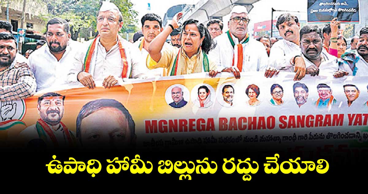 కొత్త బిల్లును వెంటనే రద్దు చేయాలని డిమాండ్ చేశారు. ఈ అంశంపై కాంగ్రెస్ పోరాటం చేస్తోందని, లోక్సభలో ఎంపీలు నిరసనలు తెలుపుతున్నారన్నారు. డాక్టర్ కోట నీలిమ మాట్లాడుతూ కోట్లాది గ్రామీణ పేదలకు చట్టబద్ధంగా లభిస్తున్న పనిహక్కును మోదీ ప్రభుత్వం హరించే ప్రయత్నం చేస్తోందని మండిపడ్డారు. పనిదినాలు, వేతనాలు పెంచాలని డిమాండ్ చేశారు. డీసీసీ అధ్యక్షుడు దీపక్ జాన్, రవి కిరణ్ దేవులపల్లి పాల్గొన్నారు.