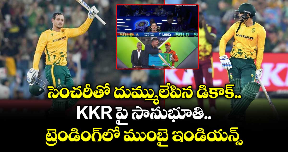 222 పరుగుల లక్ష్య ఛేదనలో బరిలోకి దిగిన సౌతాఫ్రికా ఆరంభంలోనే మార్కరం వికెట్ కోల్పోయింది. ఈ దశలో డికాక్ ఆకాశమే హద్దుగా చెలరేగాడు. రికెల్ టన్ సహకారంతో పరుగుల పారించాడు. డికాక్ ఇన్నింగ్స్ తో 17.3 ఓవర్లలోనే సౌతాఫ్రికా 222 పరుగుల టార్గెట్ పూర్తి చేసింది. ఈ మ్యాచ్ తర్వాత ఐపీఎల్ జట్టు ముంబై ఇండియన్స్ పేరు ఒక్కసారిగా మారుమ్రోగిపోతుంది. ఎందుకంటే ఐపీఎల్ 2026 మినీ వేలంలో డికాక్ ను ఎవరూ పట్టించుకోలేదు. గత సీజన్ లో విఫలం కావడంతో ఏ ఫ్రాంచైజీ ఈ సఫారీ ఓపెనర్ ను తీసుకోవడానికి ముందుకు రాలేదు. అయితే ముంబై ఇండియన్స్ మాత్రం డికాక్ ను బేస్ ప్రెస్ రూ.1 కోటి రూపాయలకు తీసుకుంది.