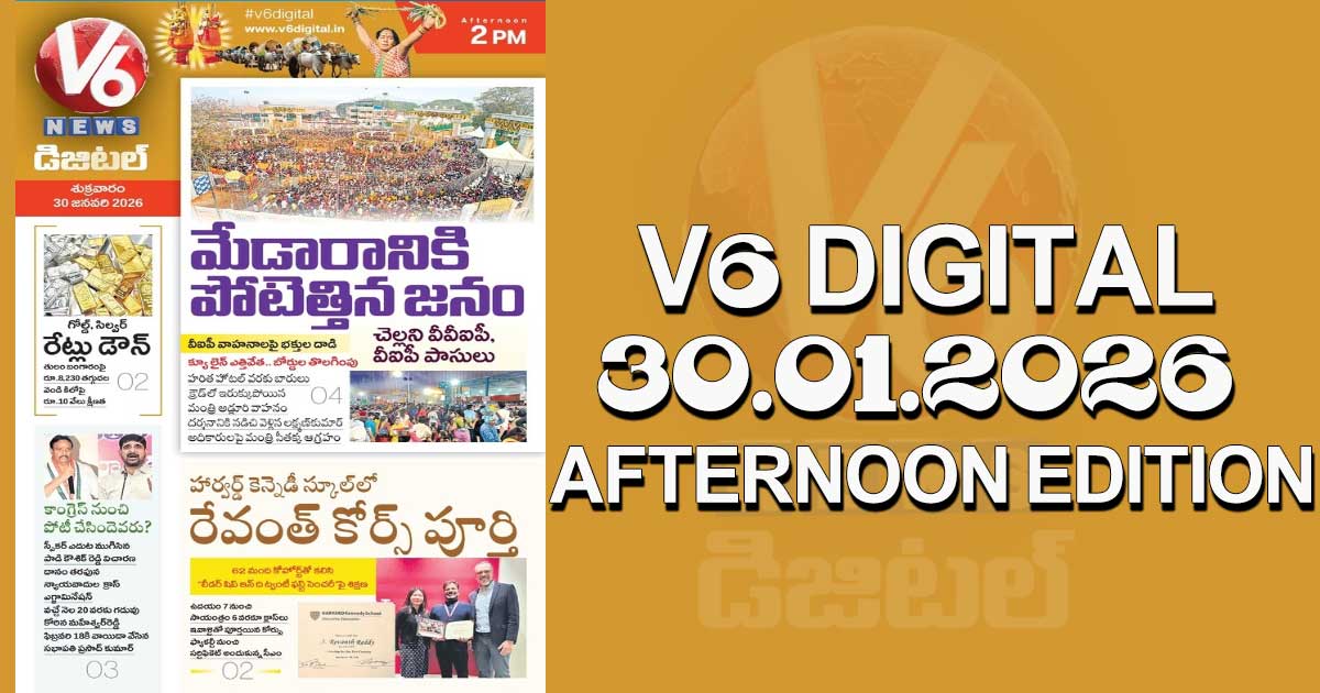 Reading Time: < 1 minute V6 DIGITAL 30.01.2026 AFTERNOON EDITION Caption of Image. మేడారానికి పోటెత్తిన జనం.. వీవీఐపీ, వీఐపీ పాసులు రద్దు సీఎం రేవంత్ కోర్సు కంప్లీట్.. సర్టిఫికేట్ అందుకున్నముఖ్యమంత్రి బంగారం, వెండి రేట్లు డౌన్.. ఎంత తగ్గాయంటే..? ఇంకా మరెన్నో.. క్లిక్ చేయండి Post navigation ఫైర్ సేఫ్టీ లేదని రాజేంద్రనగర్ లో బిల్డింగ్ సీజ్ చేసిన హైడ్రా T20 World Cup 2026: 2026 టీ20 వరల్డ్ కప్లో 300 పరుగులు ఆ రెండు జట్లకే సాధ్యం: రవిశాస్త్రి
