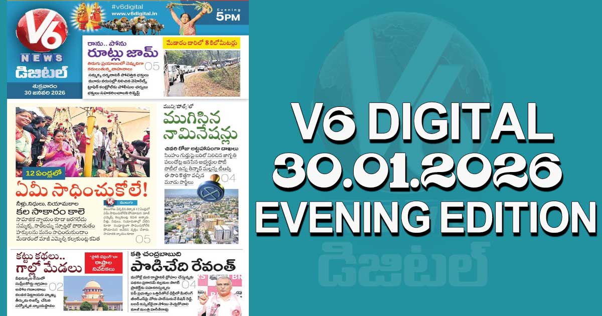 Reading Time: < 1 minute V6 DIGITAL 30.01.2026 EVENING EDITION Caption of Image. 12 ఏండ్లలో ఏమీ సాధించుకోలేదన్న కవిత మేడారం రూట్ లో ట్రాఫిక్ జామ్.. 8 కి.మీ నిలిచిన వెహికిల్స్ ముగిసిన నామినేషన్లు.. బీఫారం ఇవ్వలేదని ఒకరి ఆత్మహత్యాయత్నం ఇంకా మరెన్నో.. క్లిక్ చేయండి Post navigation తిరుమల లడ్డూ నెయ్యిలో జంతువుల కొవ్వు లేదు.. తేల్చిచెప్పిన CBI తెలంగాణ మోడల్ స్కూల్స్ అడ్మిషన్స్..దరఖాస్తులు, ఫీజు, పరీక్ష తేదీలు..ఫుల్ డిటెయిల్స్ ఇవే