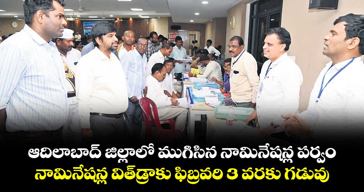 మంచిర్యాల, వెలుగు : మున్సిపల్ ఎన్నికల్లో భాగంగా ఉమ్మడి ఆదిలాబాద్ జిల్లాలో నామినేషన్ల పర్వం శనివారం ముగిసింది. ఈనెల 28 నుంచి 30 వరకు ఆయా మున్సిపాలిటీల్లోప్రత్యేక కౌంటర్లు ఏర్పాటు చేసి నామినేషన్లు స్వీకరించారు. మొదటి రోజు నామమాత్రంగా దాఖలైనప్పటికీ మిగతా రెండు రోజులు భారీ సంఖ్యలో వచ్చాయి. చివరి రోజు సాయంత్రం 5 గంటల వరకు వచ్చినవారిని లోపలికి అనుమతించి పొద్దు పోయేదాక నామినేషన్లు స్వీకరించారు. వివిధ పార్టీల నాయకులు పెద్ద ఎత్తున ర్యాలీగా వచ్చి బలప్రదర్శన చేశారు.