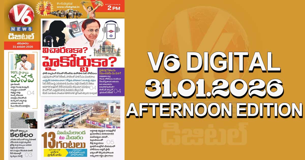 Reading Time: < 1 minute V6 DIGITAL 31.01.2026 AFTERNOON EDITION Caption of Image. సిట్ విచారణకు పోవాల్నా వద్దా? కేసీఆర్ సమాలోచనలు 13 గంటలు.. మేడారం భక్తుల నరకయాతన కోఠిలో కాల్పుల కలకలం ఇంకా మరెన్నో.. క్లిక్ చేయండి Post navigation “దేవుడా.. 400 మీటర్ల దూరానికి 18 వేల బిల్లు! అమెరికా మహిళని మోసం చేసిన టాక్సీ డ్రైవర్ అరెస్ట్.. గెలిచే అభ్యర్థులకు మాత్రమే B ఫామ్ ఇవ్వండి: అమెరికా నుంచి సీఎం రేవంత్ దిశానిర్దేశం