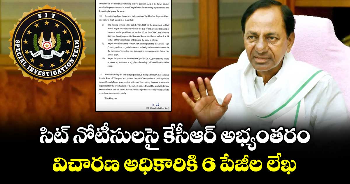 సిట్ నోటీసులపై బీఆర్ఎస్ అధినేత కేసీఆర్ తీవ్ర అభ్యంతరం వ్యక్తం చేశారు. శనివారం (జనవరి 31) సిట్ విచారణాధికారిగా ఉన్న జూబ్లీహిల్స్ ఏసీపీకి 6 పేజీల లేఖ రాశారు. లేఖలో పలు అంశాలను ప్రస్థావించారు కేసీఆర్. ఇంటి గోడకు సిట్ నోటీసులు అంటించడంపై తీవ్ర అభ్యంతరం వ్యక్తం చేశారు కేసీఆర్ . చట్టంలో గోడలకు నోటీసులు అంటించాలని ఎక్కడా లేదని లేఖలో పేర్కొన్నారు. రేపు (ఫిబ్రవరి 01) విచారణకు హాజరవుతానని లేఖలో పేర్కొన్నారు కేసీఆర్.
