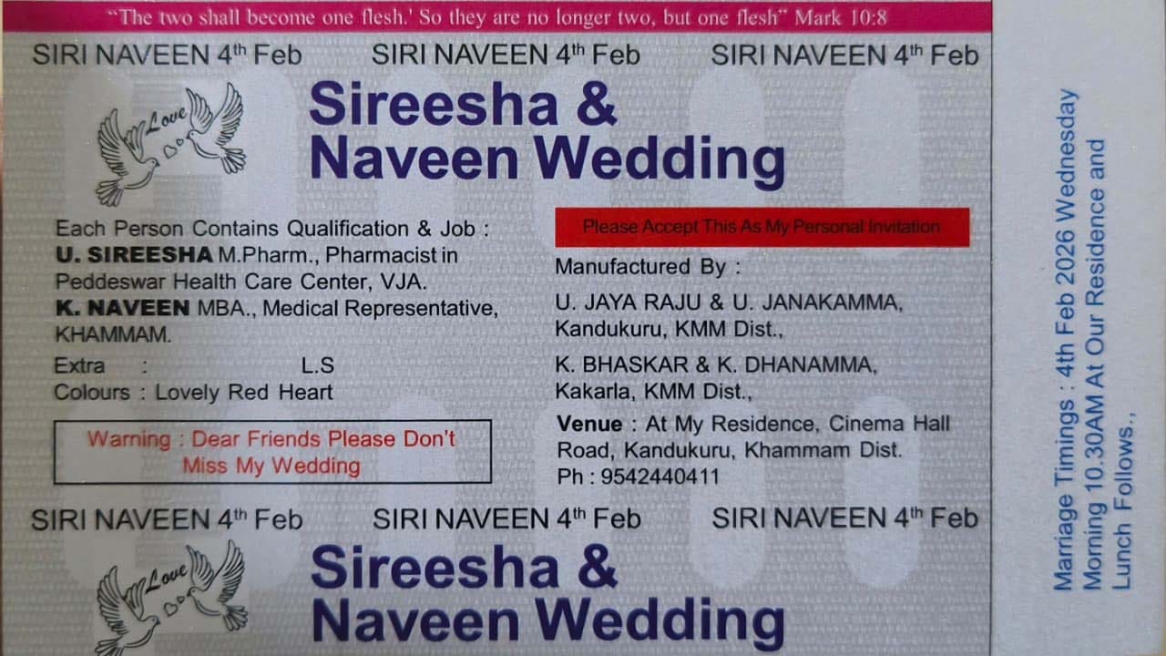 ఈ వెడ్డింగ్ కార్డ్ ఇప్పుడు సోషల్ మీడియాలో స్థానికంగా చర్చనీయాంశంగా మారింది. శిరీష కు కాబోయే భర్త కాకర్ల గ్రామానికి చెందిన కిన్నెర నవీన్ ఎంబీఏ పూర్తి చేసి మెడికల్ రిప్రజెంటేటివ్గా పనిచేస్తున్నాడు. వధువు, వరుడు ఇద్దరు ఫార్మా రంగానికి చెందిన వారు కావడంతో, తమ వివాహ ఆహ్వాన పత్రిక కూడా అదే శైలిలో ఉండాలని డిఫరెంట్ ఆలోచన చేశారు. ఇప్పుడు ఇది సోషల్ మీడియాలో వైరల్ గా మారింది.