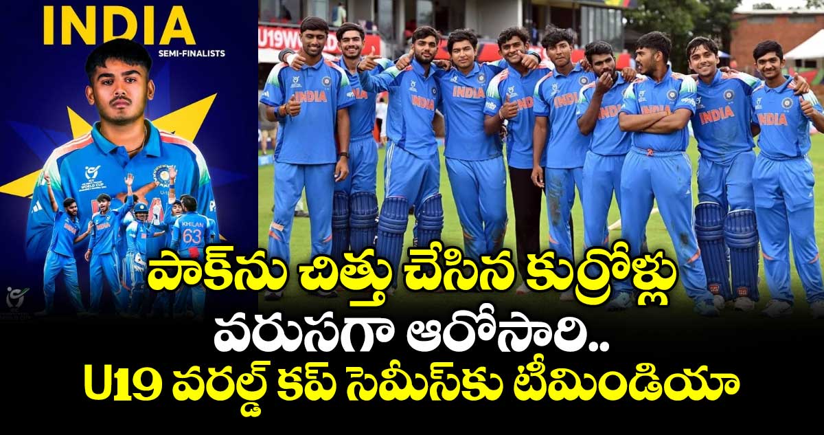 అండర్ 19 వరల్డ్ కప్లో టీమిండియా వరుసగా ఆరోసారి సెమీస్కు చేరుకుంది. ఆదివారం (ఫిబ్రవరి 1) బులవాయోలోని క్వీన్ స్పోర్ట్స్ క్లబ్లో జరిగిన మ్యాచులో పాకిస్తాన్పై భారత ఘన విజయం సాధించింది. తప్పక గెలవాల్సిన మ్యాచులో బ్యాటింగ్, బౌలింగ్ విభాగాల్లో సమిష్టిగా రాణించి దాయాది దేశాన్ని 58 పరుగుల తేడాతో చిత్తు చేసింది. తద్వారా 2025 అండర్ 19 ఆసియా కప్ ఫైనల్ ఓటమికి టీమిండియా కుర్రాళ్లు ప్రతీకారం తీర్చుకున్నారు. సెమీస్ పోరులో భాగంగా ఇండియా ఇంగ్లాండ్తో తలపడనుంది.