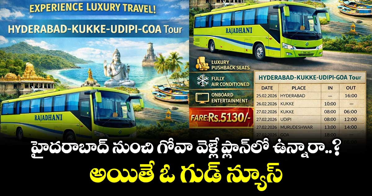 హైదరాబాద్: తెలంగాణ ఆర్టీసీ హైదరాబాద్ నుంచి గోవాకు టూర్ ప్యాకేజ్ ప్రకటించింది. ఫిబ్రవరి 25, 2026 న BHEL లింగంపల్లి నుంచి బయల్దేరే బస్సు.. కుక్కే సుబ్రహ్మణ్య స్వామి ఆలయం, ఉడిపి, మురుడేశ్వర్ ఆలయం మీదుగా గోవా వెళ్లి, తిరుగు ప్రయాణం 01/03/2026న ఉదయం 6 గంటలకు బయలుదేరి గోవా నుంచి MGBS మీదుగా లింగంపల్లి వస్తుంది. ఈ సర్వీస్కు ప్రయాణ రుసుము 5130 రూపాయలు.