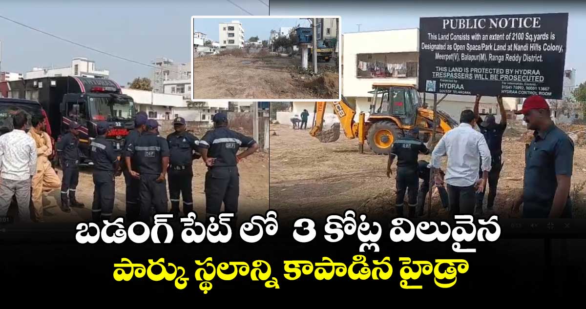 ఆక్రమణలపై హైడ్రా మరోసారి పంజా విసిరింది. ప్రభుత్వ భూమిని ఆక్రమించి వేసిన లేఔట్లను తొలగించి కోట్ల విలువైన స్థలాన్ని కాపాడింది. ఫిబ్రవరి 4న బడంగ్పేట్ సర్కిల్ లో కబ్జాకు గురైన పార్కు స్థలంలో ఆక్రమణలు తొలగించి ఫెన్సింగ్ వేసింది, ప్రశాంతి డివిజన్లో నందిల్స్ రోడ్ నెంబర్–8 లో 24,25,26 సర్వే నెంబర్లలో మొత్తం 2100 గజాల ప్రభుత్వ పార్కు స్థలంలో సుమారు 600 గజాల స్థలం కబ్జాకు గురైందని హైడ్రా అధికారులకు ఫిర్యాదు అందింది.