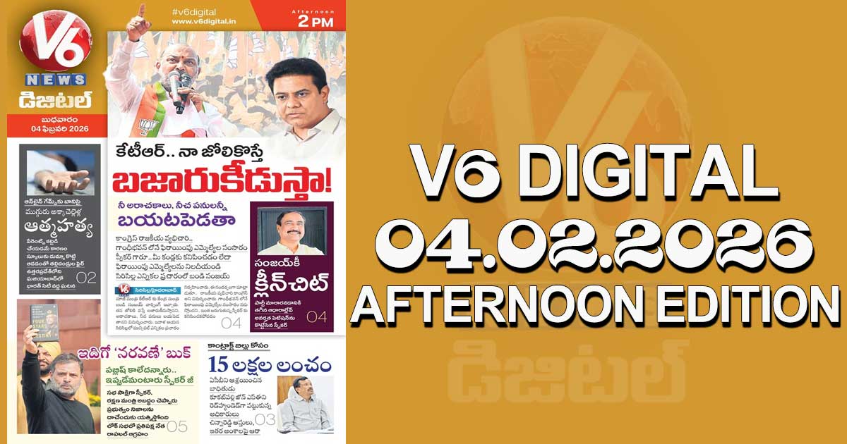 Reading Time: < 1 minute V6 DIGITAL 04.02.2026 AFTERNOON EDITION Caption of Image. కేటీఆర్ ను బజారుకీడుస్తానన్న కేంద్ర మంత్రి ఇదిగో ఆ బుక్.. స్పీకర్, రక్షణ మంత్రి అబద్ధం చెప్పారన్న రాహుల్.. సంజయ్.. పార్టీ మారినట్టు ఆధారాల్లేవన్న స్పీకర్ ఇంకా మరెన్నో.. క్లిక్ చేయండి Post navigation లాయర్ అవతారమెత్తిన సీఎం మమతా.. SIRపై సుప్రీం కోర్టులో స్వయంగా వాదనలు సేఫ్టీలో సూపర్: ఏబీఎస్ ఫీచర్తో సరికొత్త సుజుకి యాక్సెస్ 125 లాంచ్..6.99% వడ్డీకే లోన్