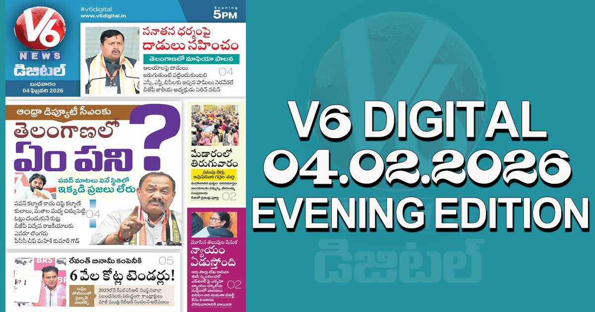 Reading Time: < 1 minute V6 DIGITAL 04.02.2026 EVENING EDITION Caption of Image. ఆంధ్రా డిప్యూటీ సీఎంకు ఇక్కడేం పని అంటున్నపీసీసీ చీఫ్ రేవంత్ బినామీ కంపెనీకి ఆరు వేల కోట్ల కాంట్రాక్టు ఇచ్చారన్న కేటీఆర్ సుప్రీంలో వాడీ వేడిగా వాదనలు వినిపించిన సీఎం మమత ఇంకా మరెన్నో.. క్లిక్ చేయండి Post navigation రైతులకు గుడ్ న్యూస్ : మున్సిపల్ ఎన్నికలు ముగిసిన వెంటనే రైతు భరోసా డబ్బులు : సీఎం రేవంత్ అన్నం తినేటోడు ఎవడైనా మొగుడు పెండ్లం మాటలు వింటాడా: సీఎం రేవంత్