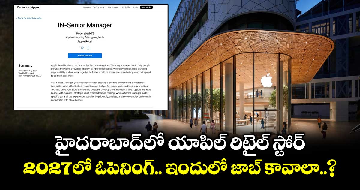 యాపిల్ సంస్థ స్టోర్ జాబ్స్ కోసం ఒక సంవత్సరం ముందు నుంచే అర్హత ఉన్న ఉద్యోగుల కోసం నోటిఫికేషన్ ఇస్తుంది. అంటే.. 2027 ప్రథమార్థంలో హైదరాబాద్ సిటీలో యాపిల్ రిటైర్ స్టోర్ ఓపెన్ చేసే అవకాశం ఉంది. దేశంలోని ప్రధాన నగరాలైన ఢిల్లీ, ముంబై, బెంగళూరులో యాపిల్ రిటైల్ స్టోర్స్ ఇప్పటికే ఓపెన్ అయిన సంగతి తెలిసిందే. హైదరాబాద్లో కూడా 2027 మార్చి నాటికి యాపిల్ రిటైల్ స్టోర్ కార్యకలాపాలు మొదలయ్యే అవకాశాలున్నాయి.